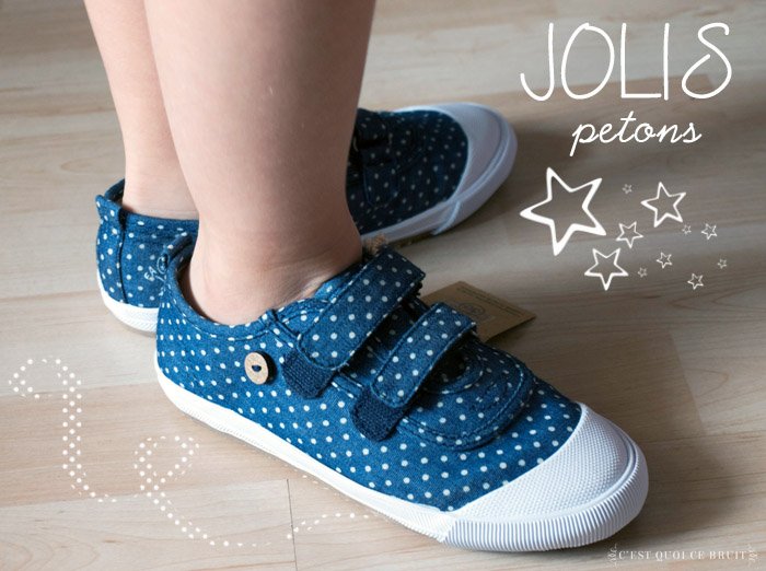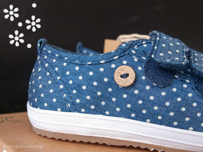 J’ai choisi une petite paire de baskets en toile façon denim à pois. Comme je suis une fille super sympa, j’ai pensé à prendre à scratch pour une fois, j’imagine le nombre de fois où les atsem doivent refaire les lacets à l’école. D’ailleurs cet été, il faut que j’apprenne à Miss L à les faire (je vais refiler le bébé à son grand-père) pour être prête pour le CP (oh my God !! le CP !!).