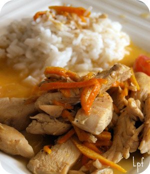 Coucou ! je suis de très bonne humeur aujourd’hui… je L‘ai reçu ! mon Robot artisan * ! j’ai hâte de le tester !!! je vous en reparlerai… En attendant, j’ai piqué une recette de dinde à l’orange à Lavande, que j’ai faite… au poulet. Pour le zeste, vous pouvez utiliser un zesteur ou, comme moi, un économe